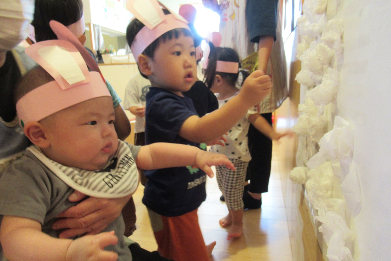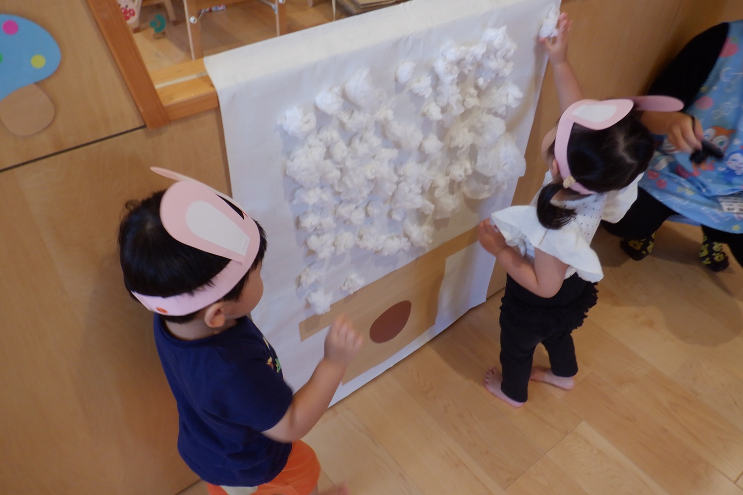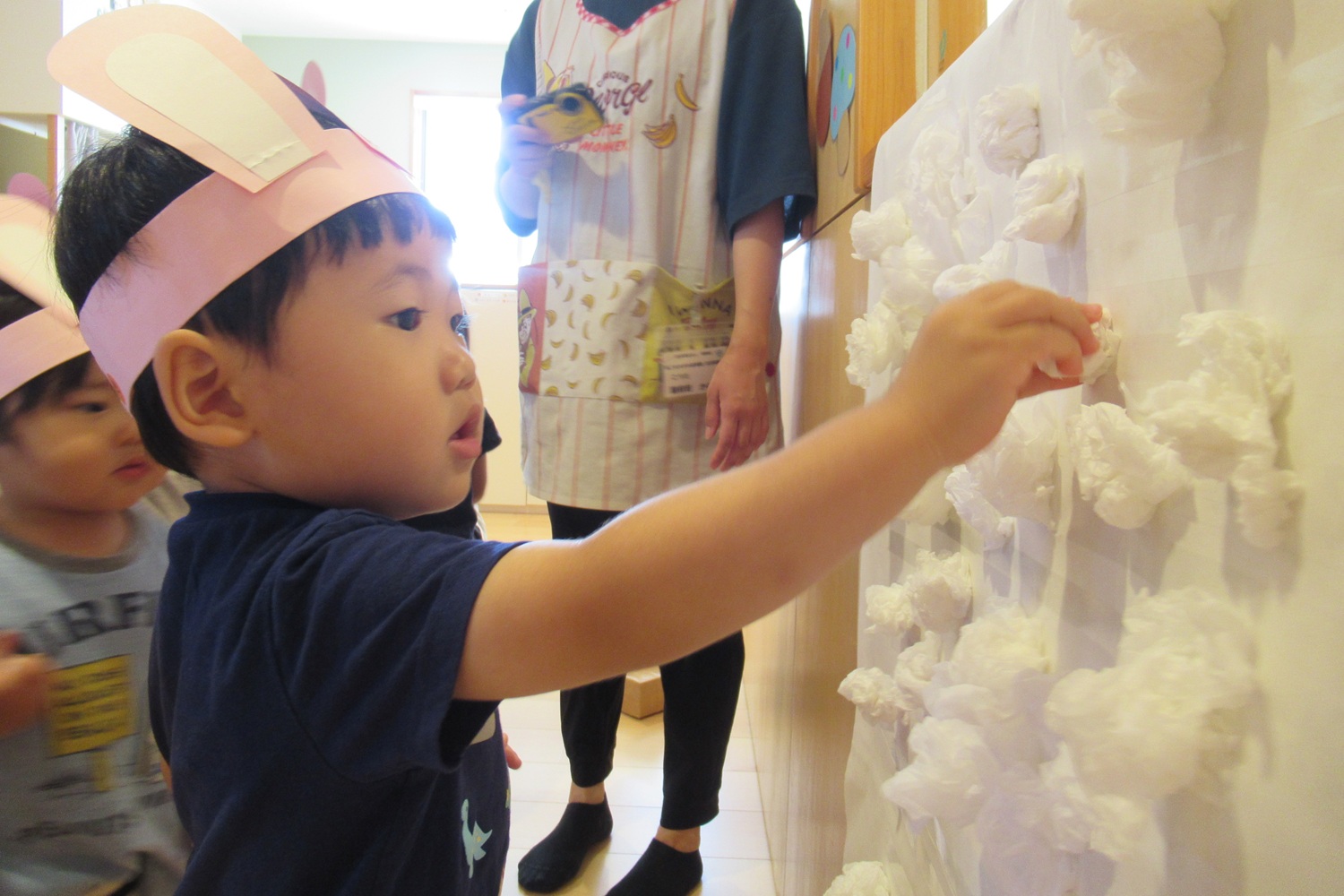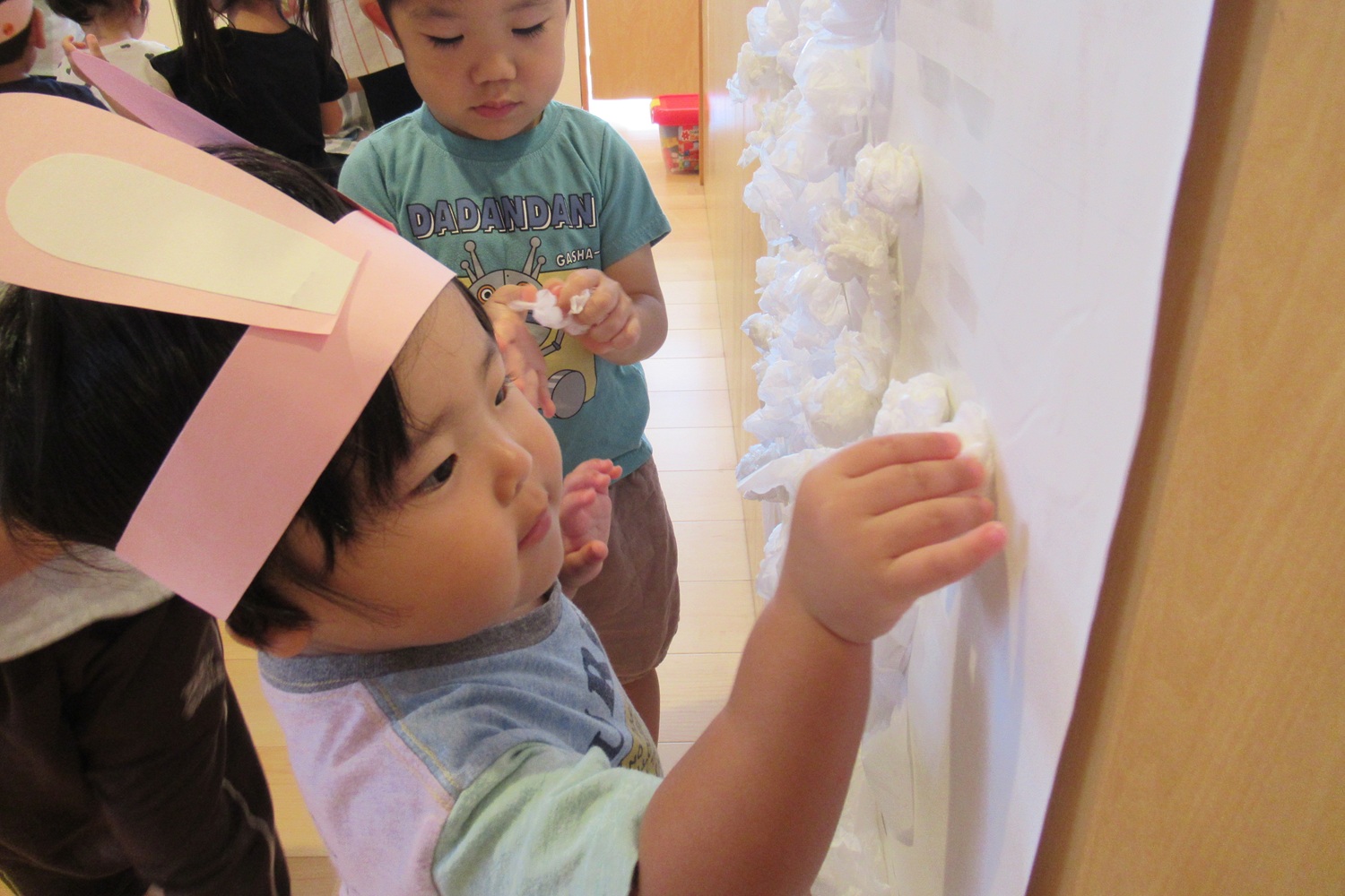 最後は、みんなで花紙を「ぎゅっ!ぎゅっ!」と丸めてペタペタ貼ってお月見のお団子が完成しました~🎑