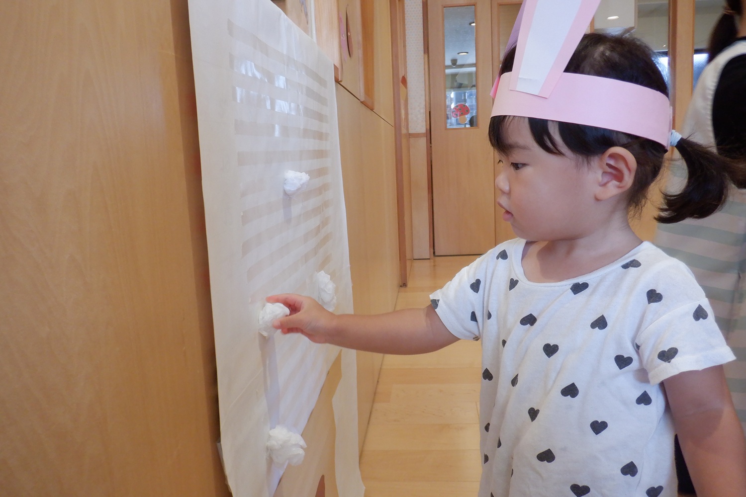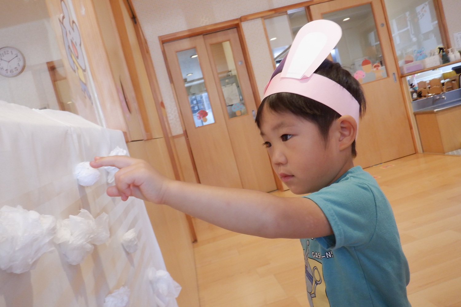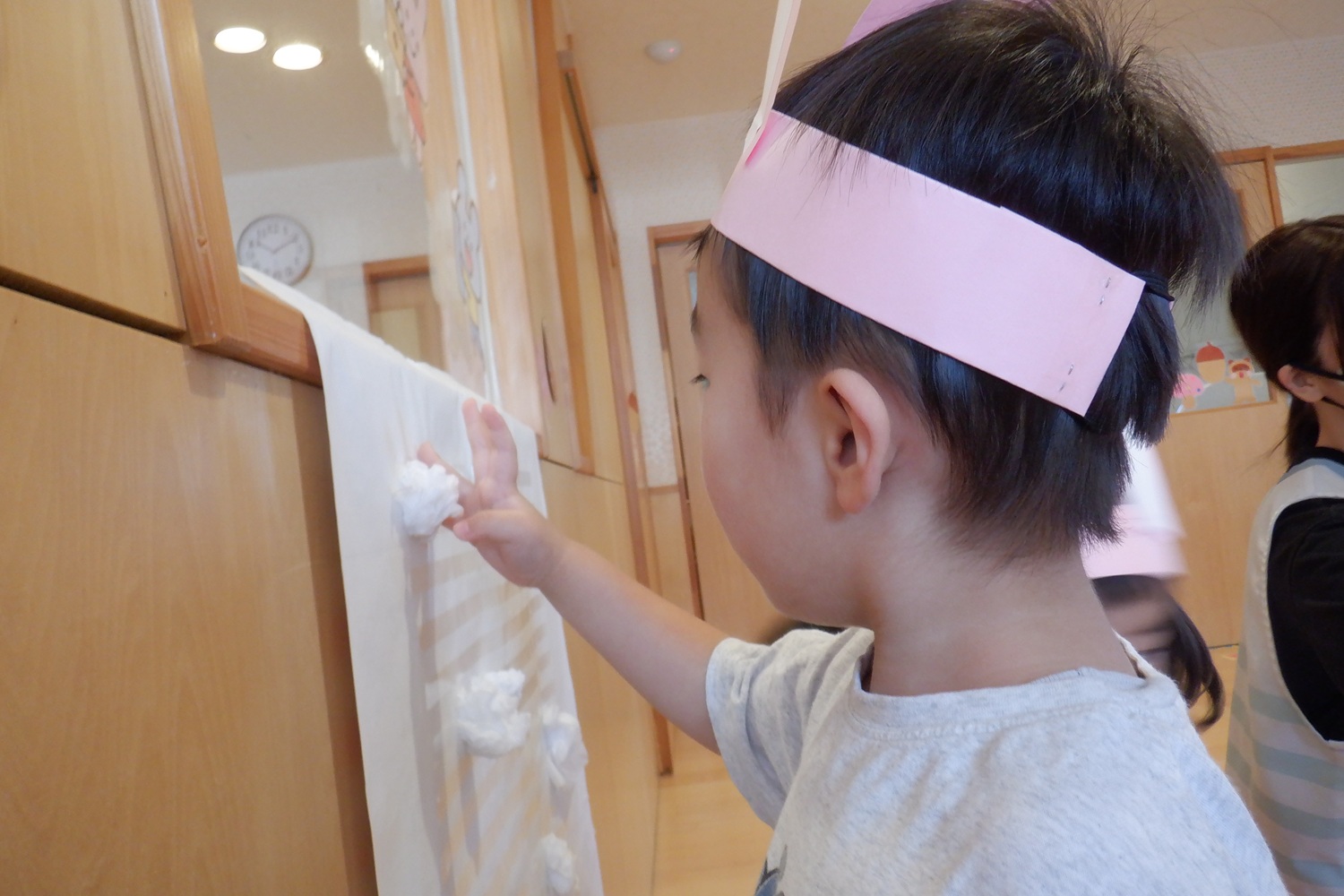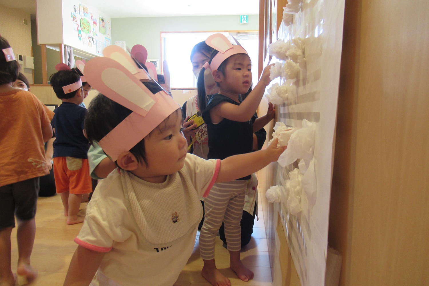 最後は、みんなで花紙を「ぎゅっ!ぎゅっ!」と丸めてペタペタ貼ってお月見のお団子が完成しました~🎑