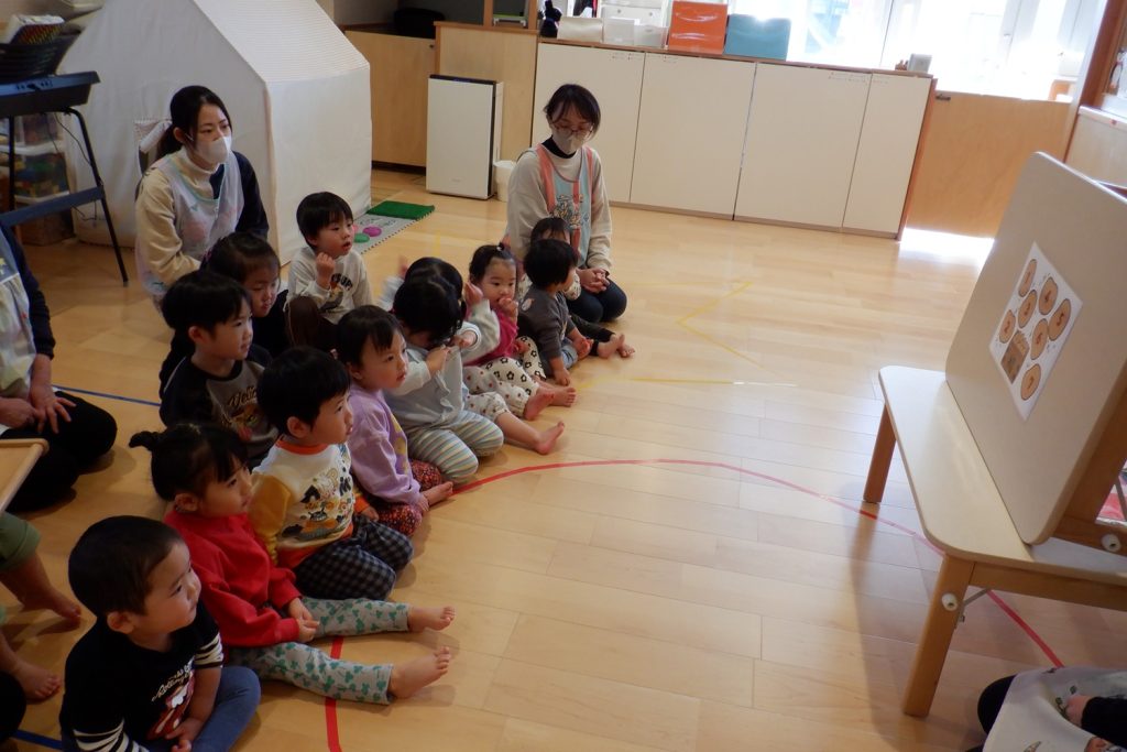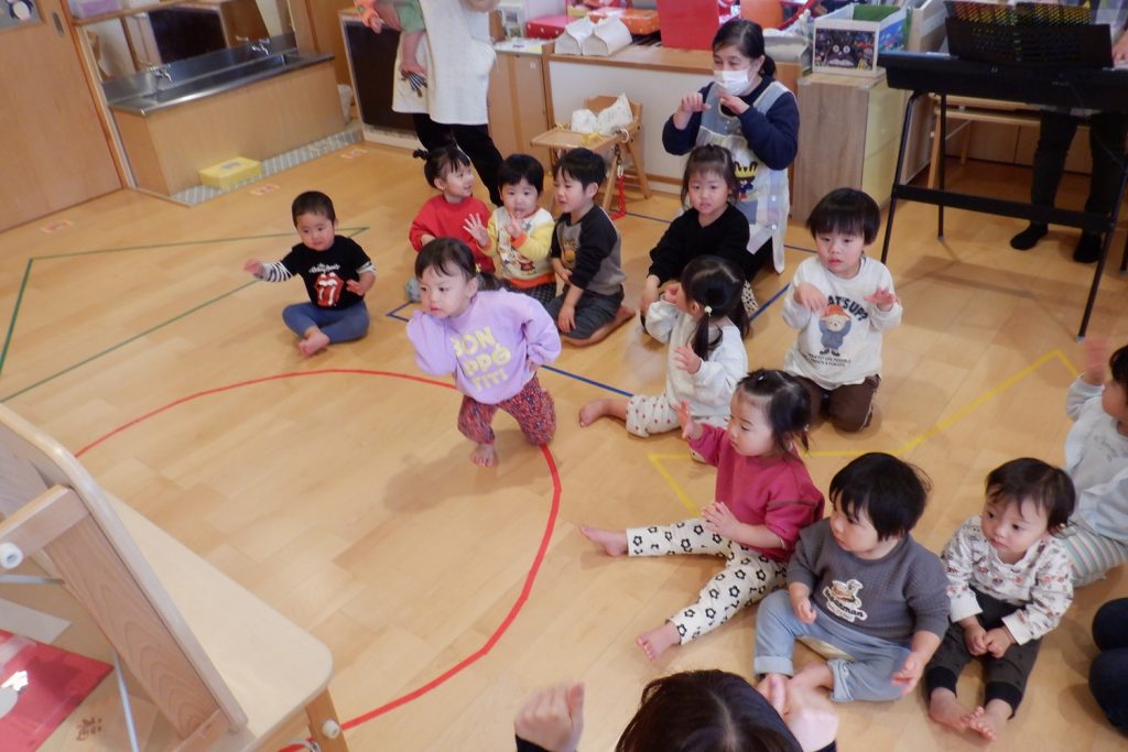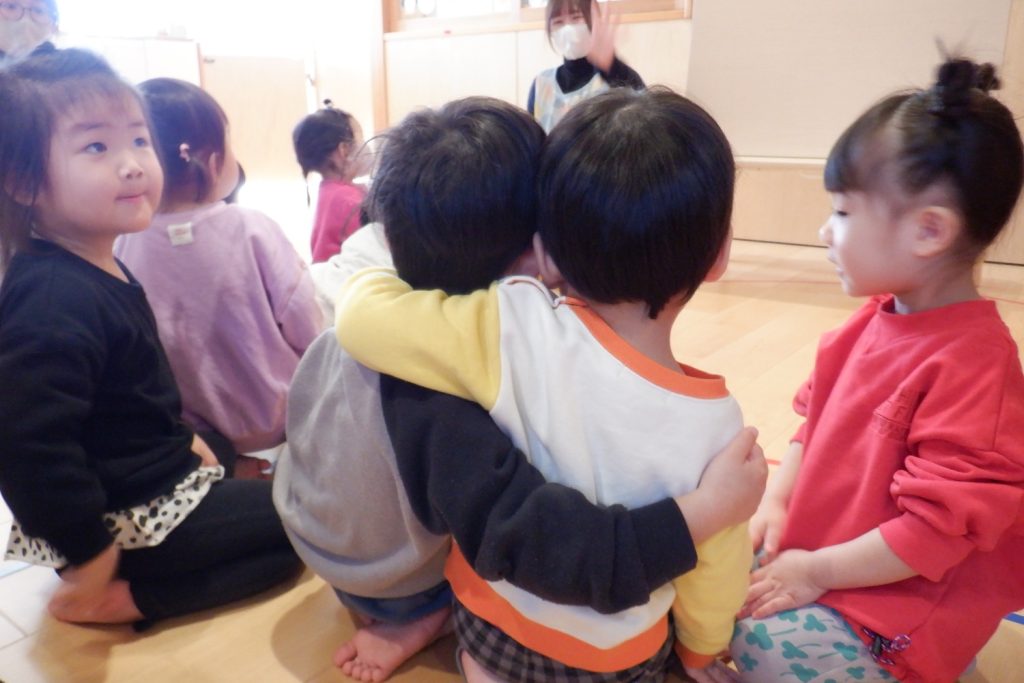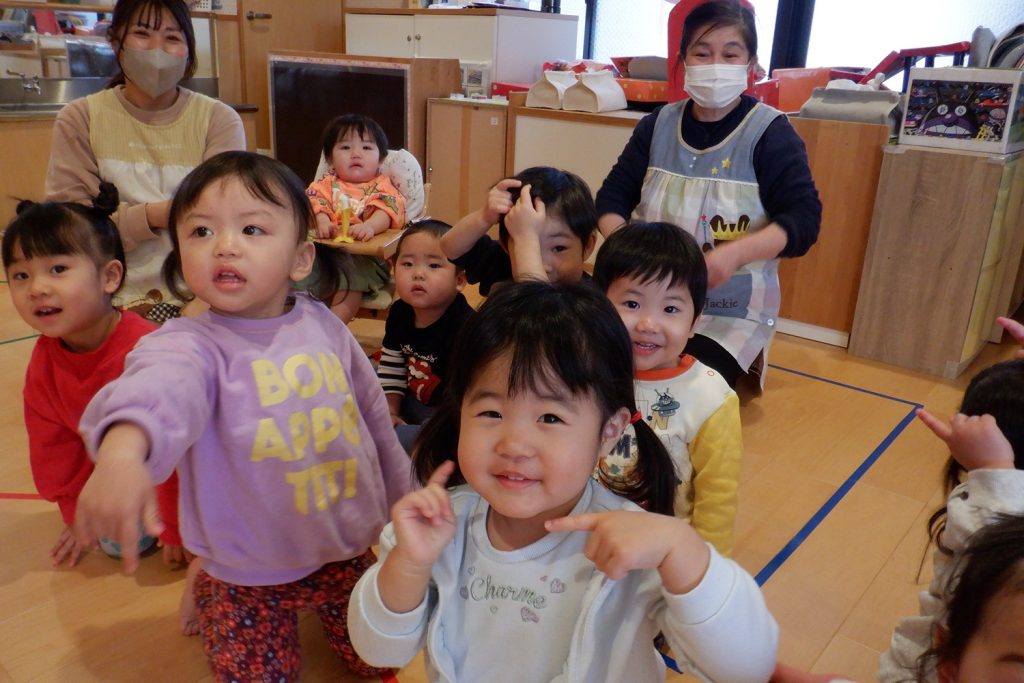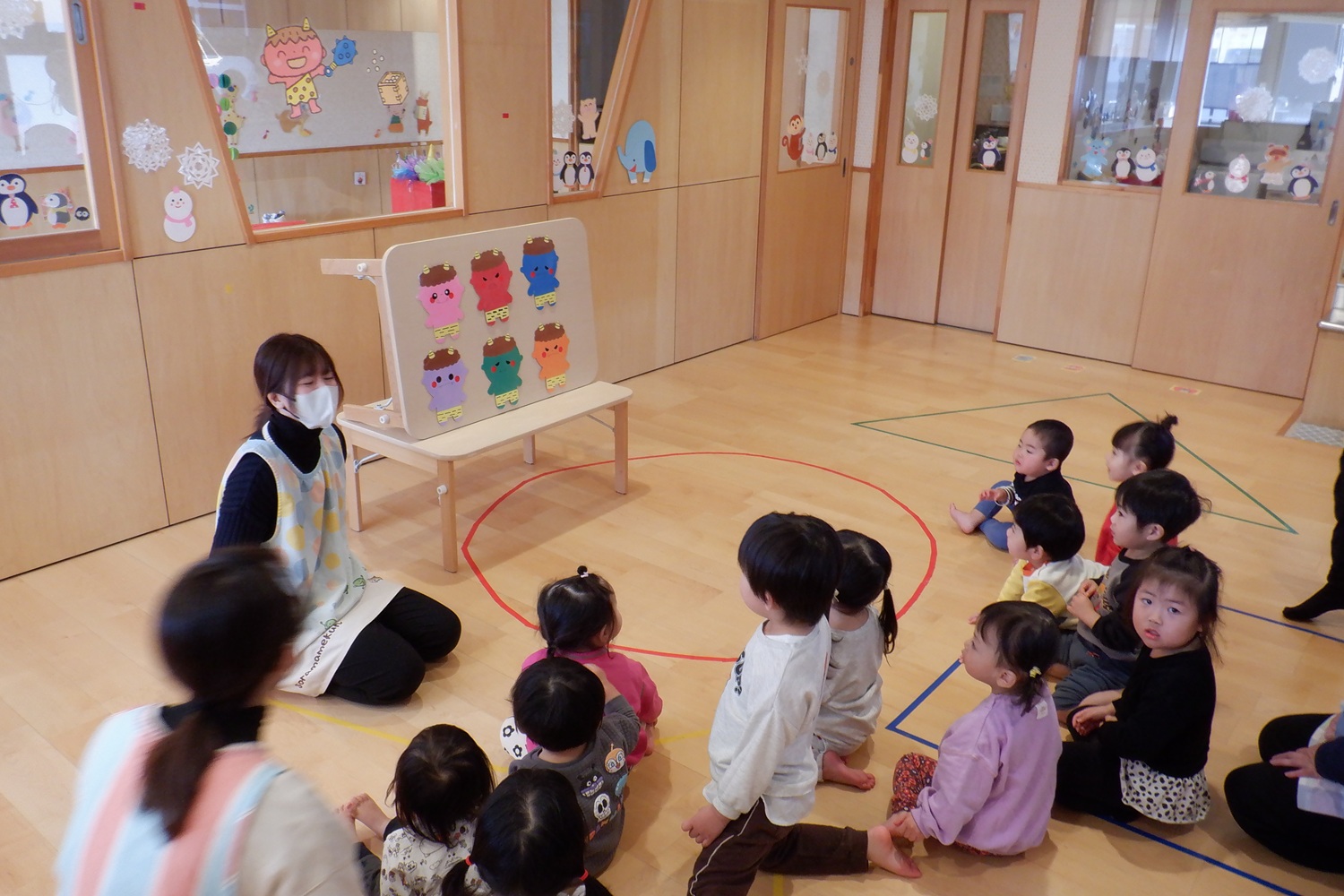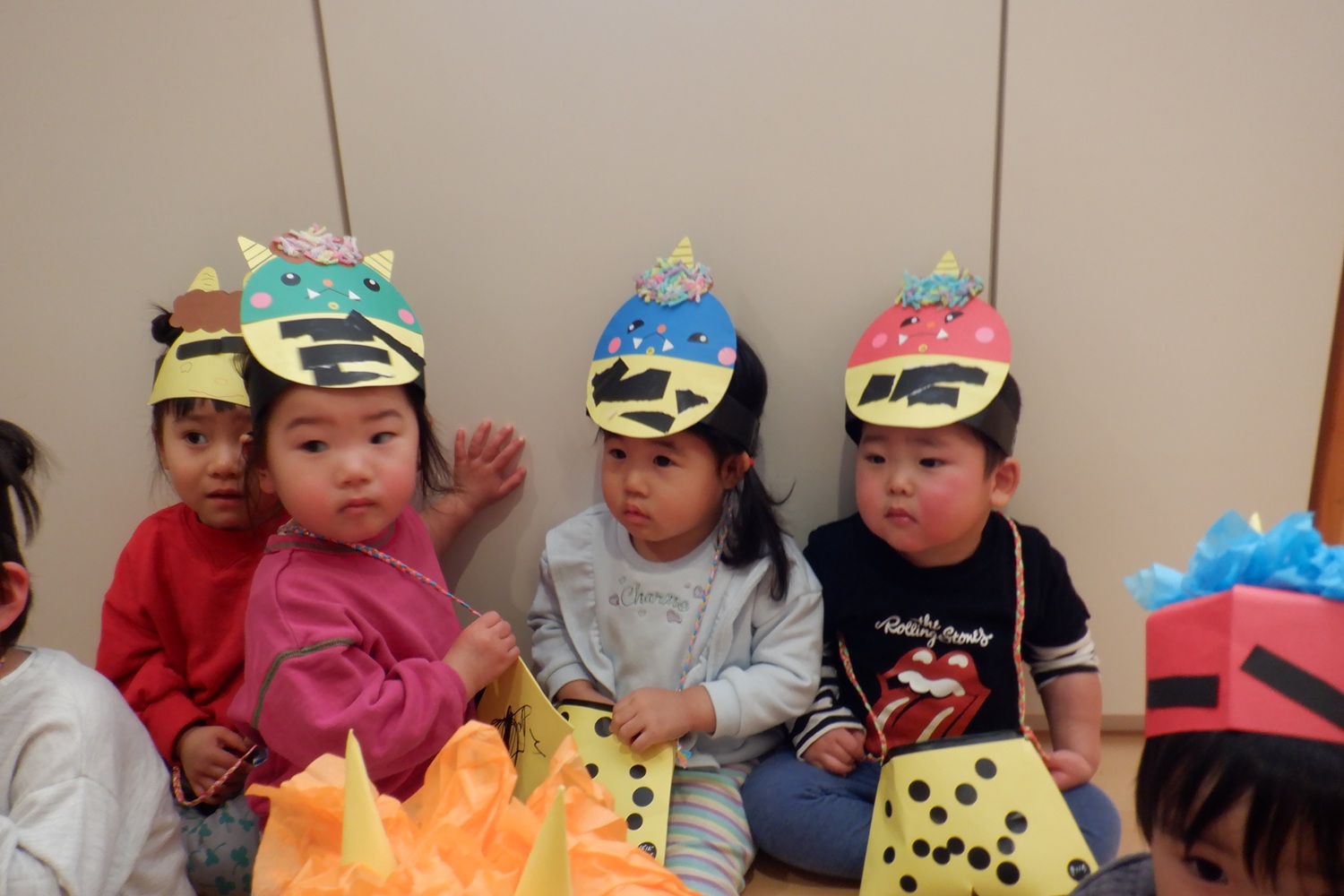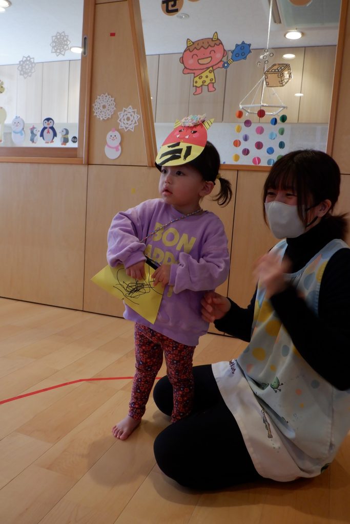 節分の由来を聞いて、泣き虫鬼😭や怒りんぼう鬼😠に豆をペタッと貼ってくれたり、豆まき🎵を歌ったりと元気いっぱいな子ども達💛