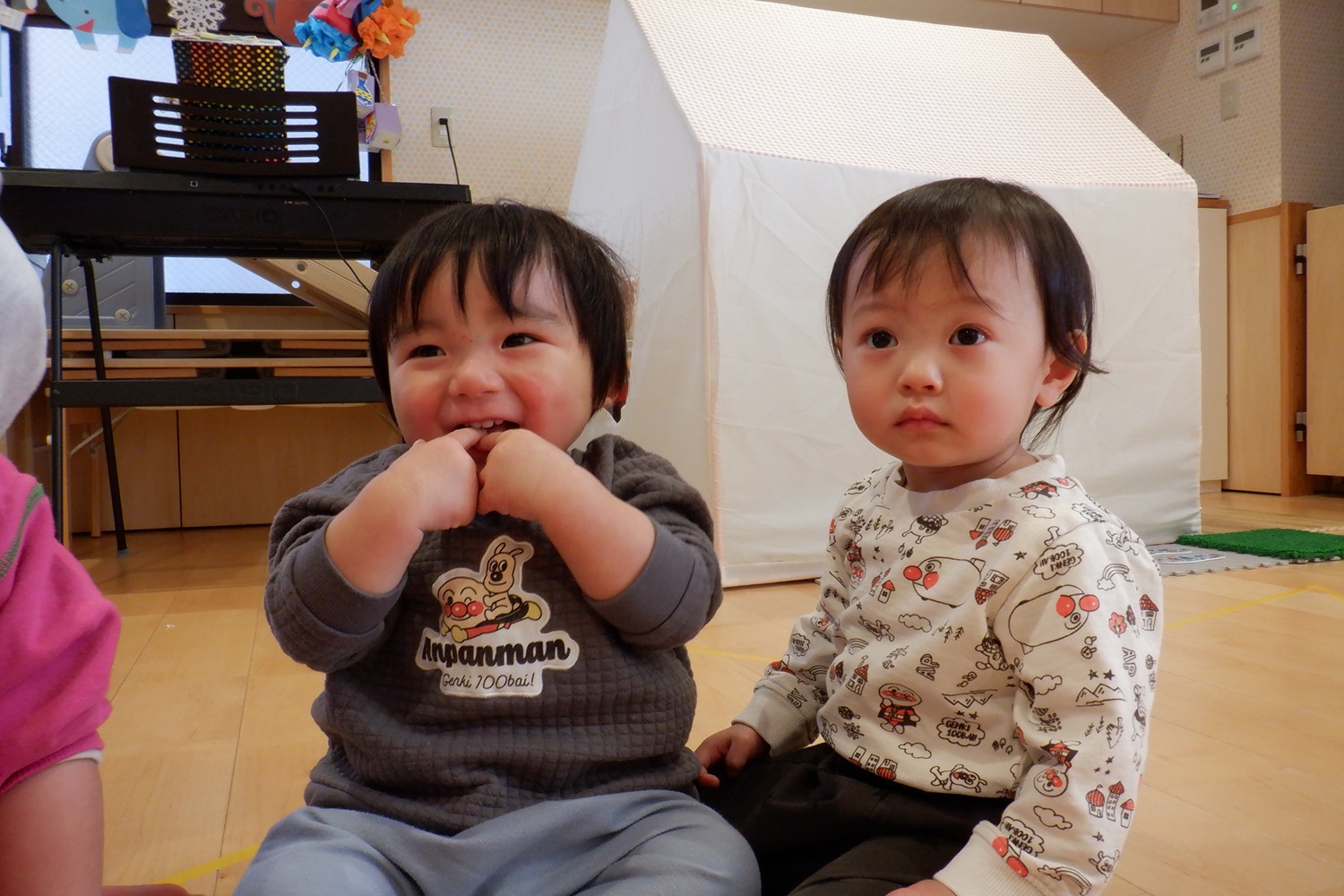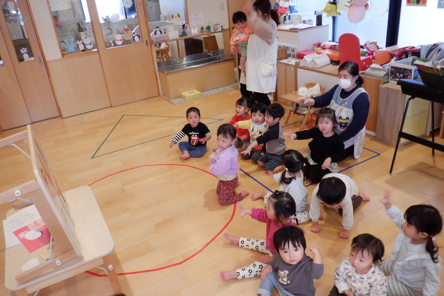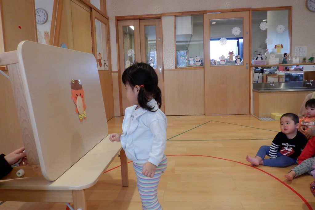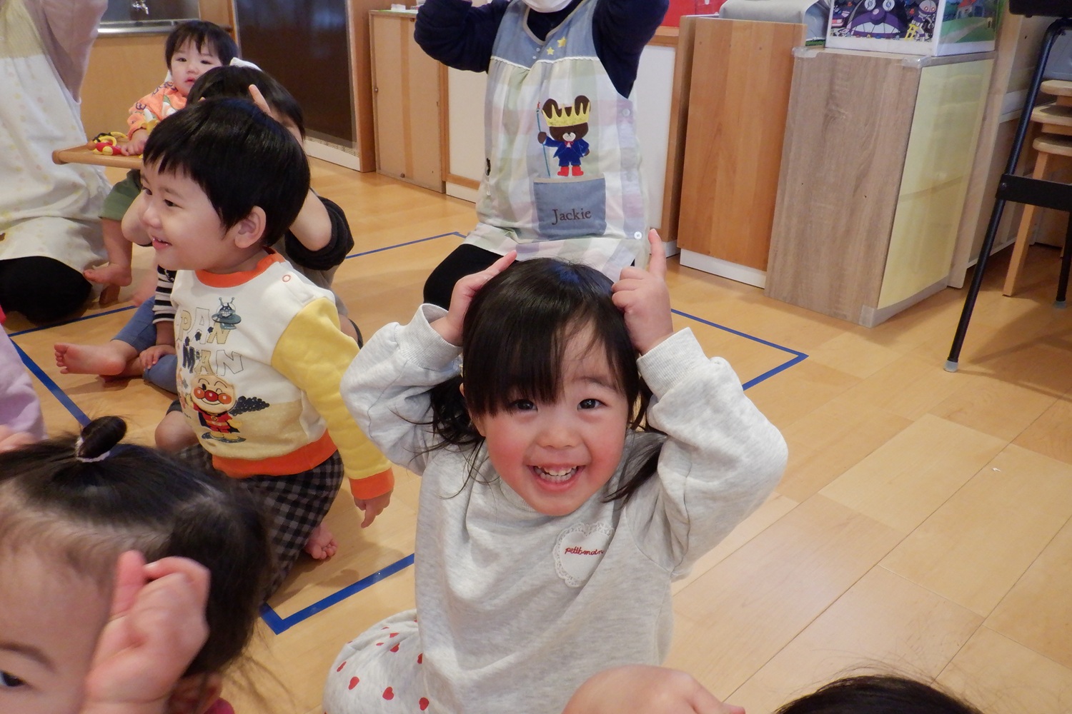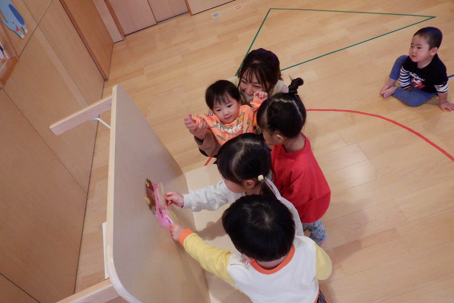 節分の由来を聞いて、泣き虫鬼😭や怒りんぼう鬼😠に豆をペタッと貼ってくれたり、豆まき🎵を歌ったりと元気いっぱいな子ども達💛