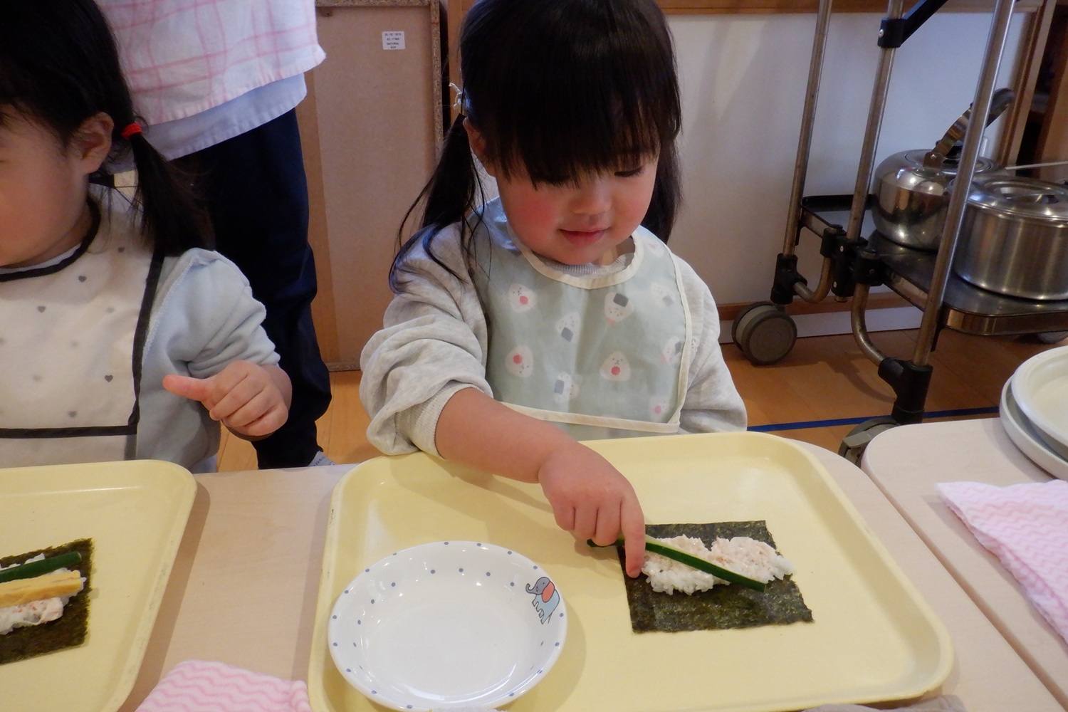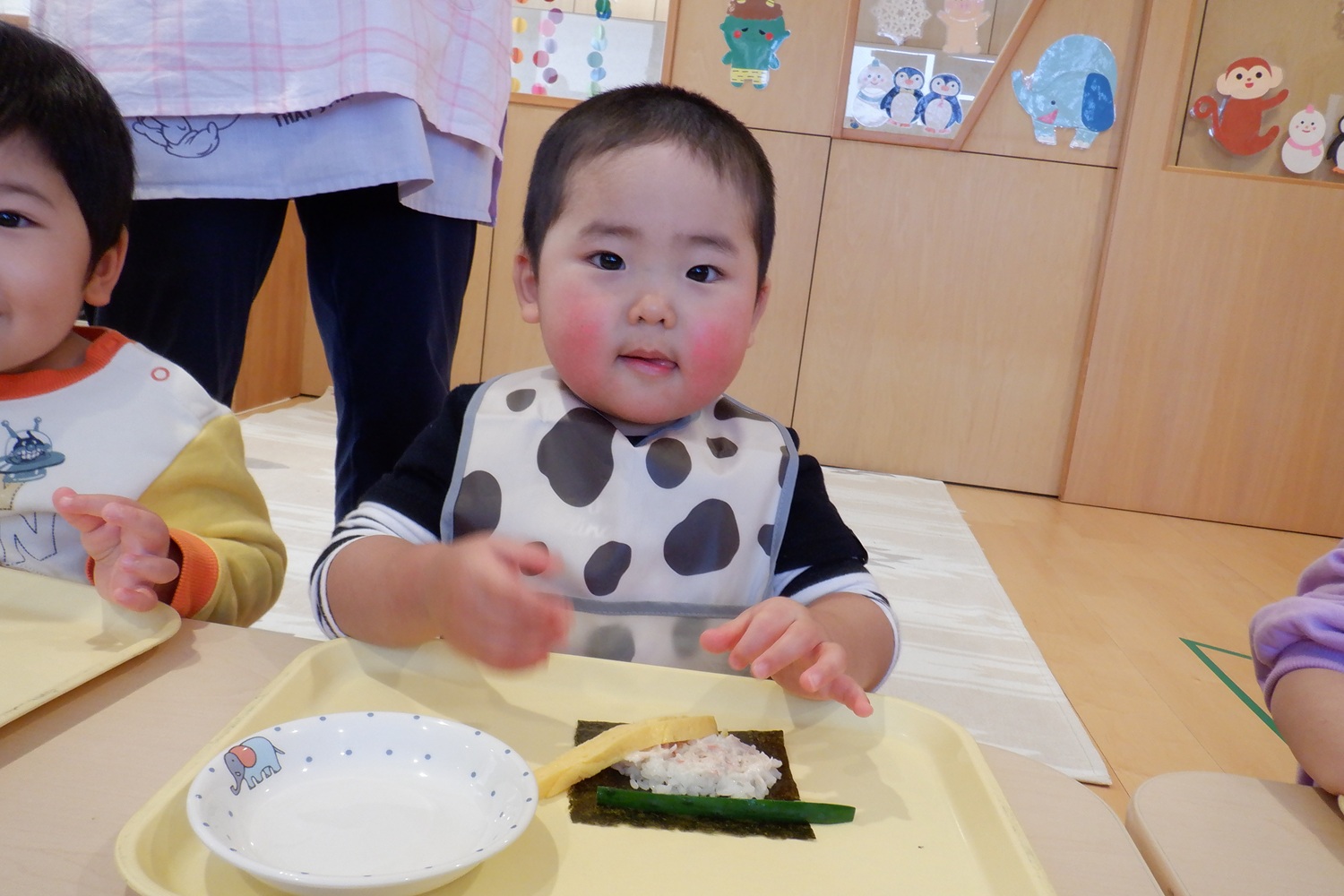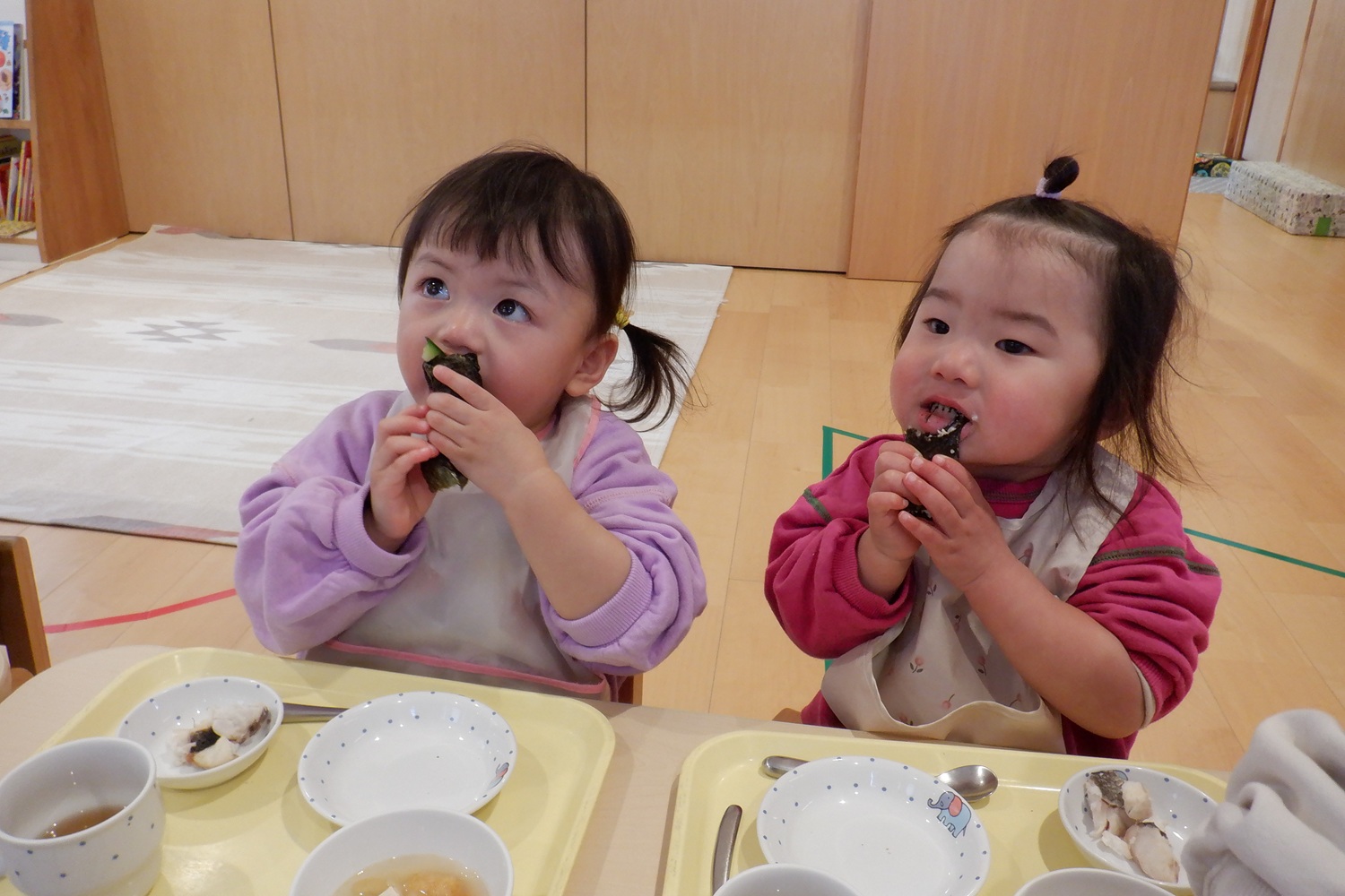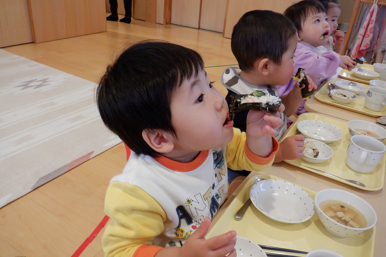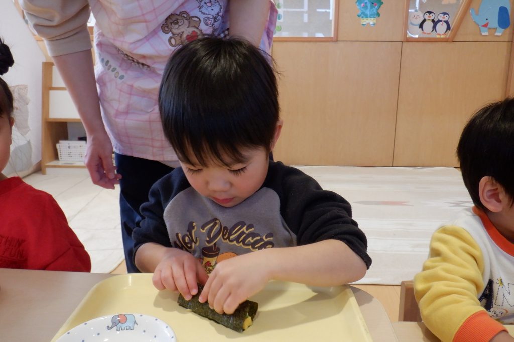 給食は恵方巻き❣今年の方角は南南東🧭みんなで巻き巻きして静か~に🤫食べました❣みんなのお願いごとが叶いますように~💖
