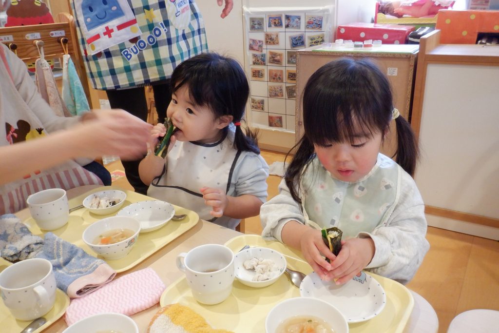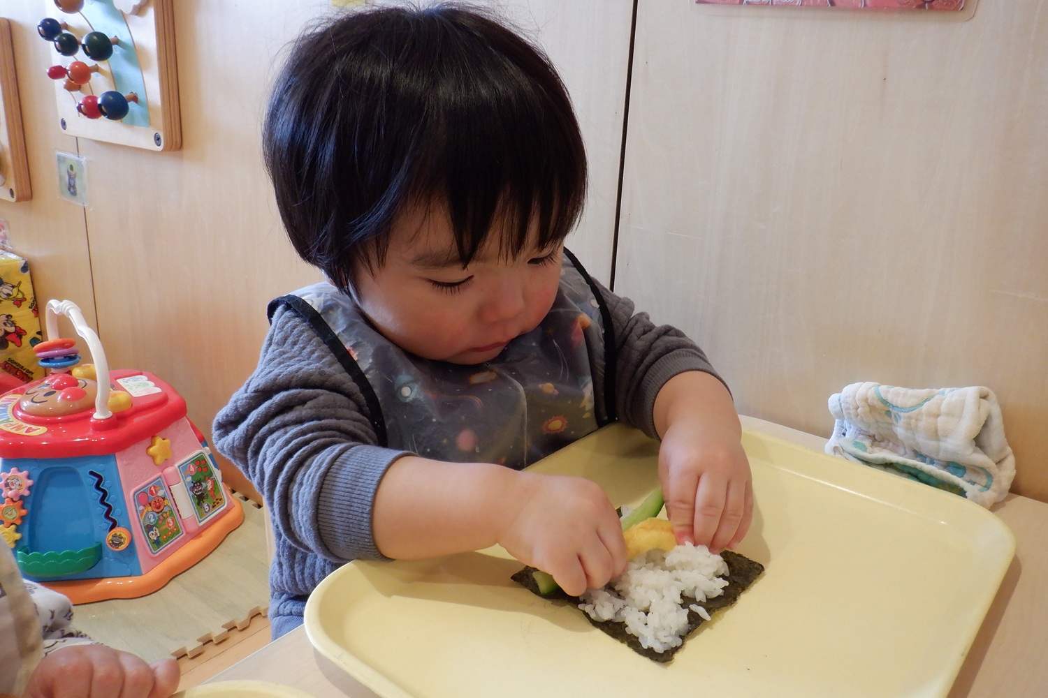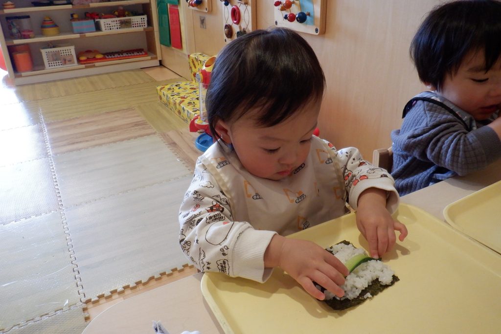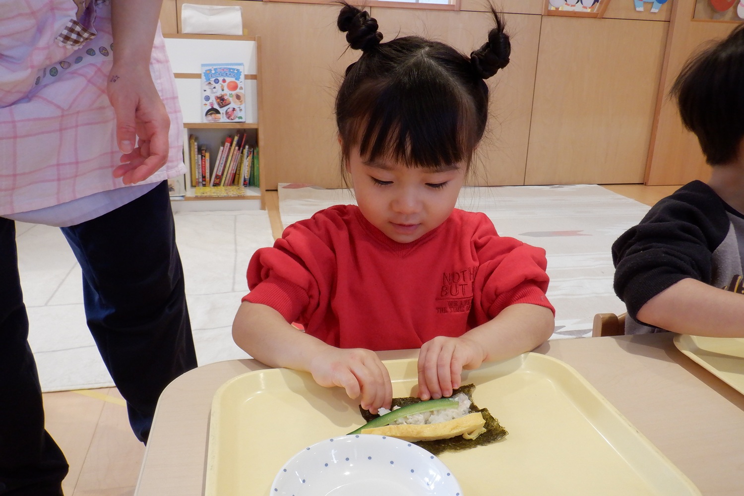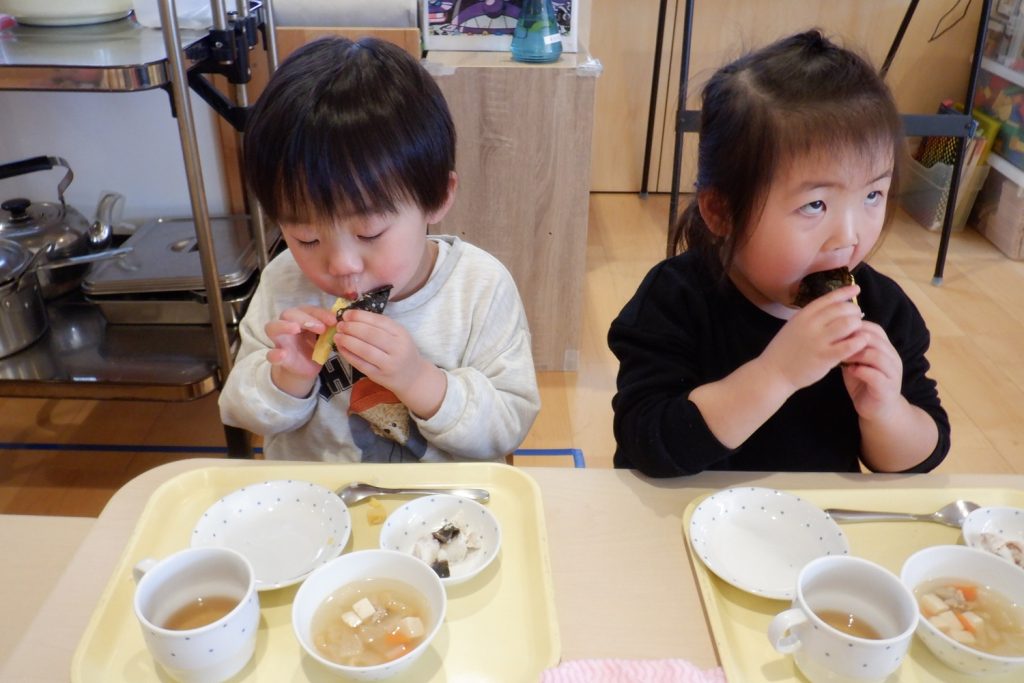 給食は恵方巻き❣今年の方角は南南東🧭みんなで巻き巻きして静か~に🤫食べました❣みんなのお願いごとが叶いますように~💖
