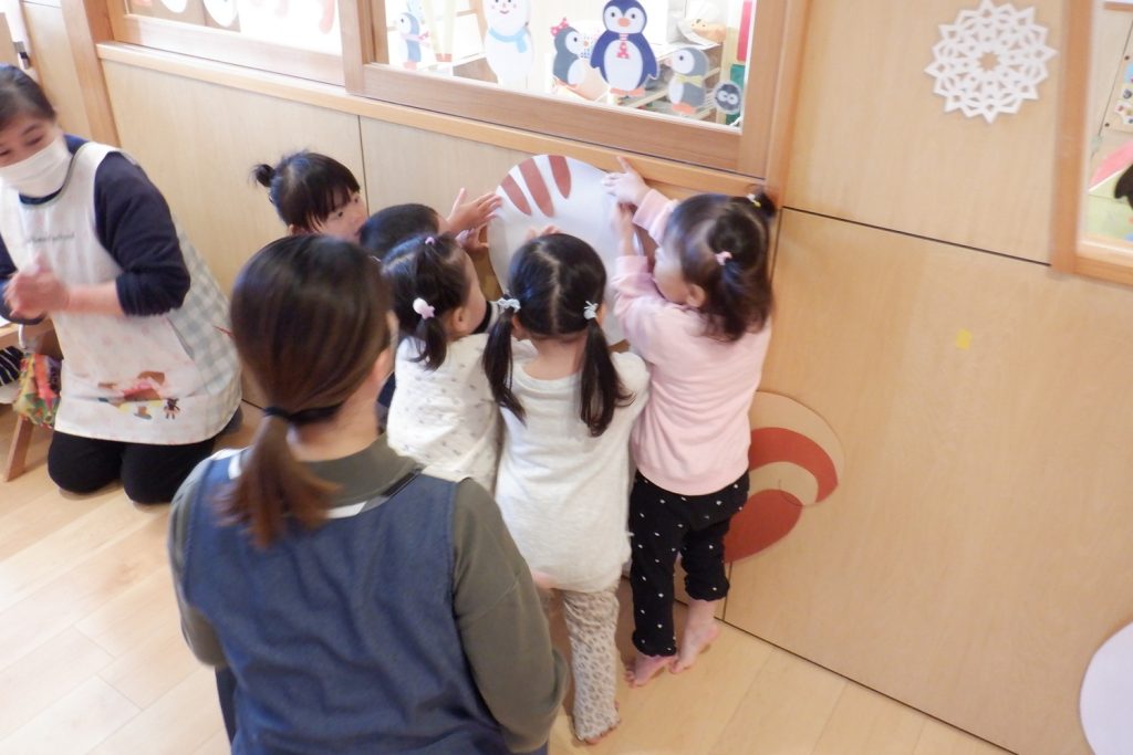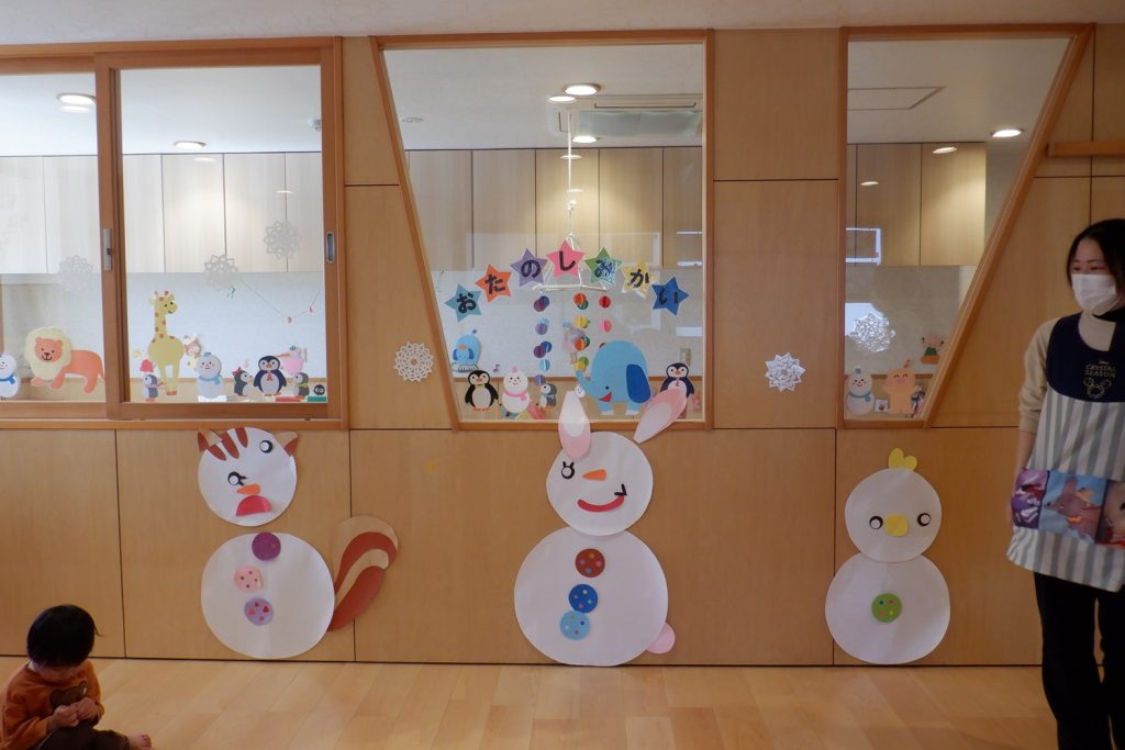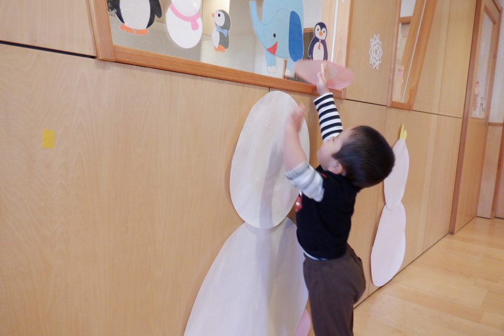 まずは、雪だるまの顔を各クラス🐣🐿🐰「よいしょ!」と運んで貼ってくれましたよ❣