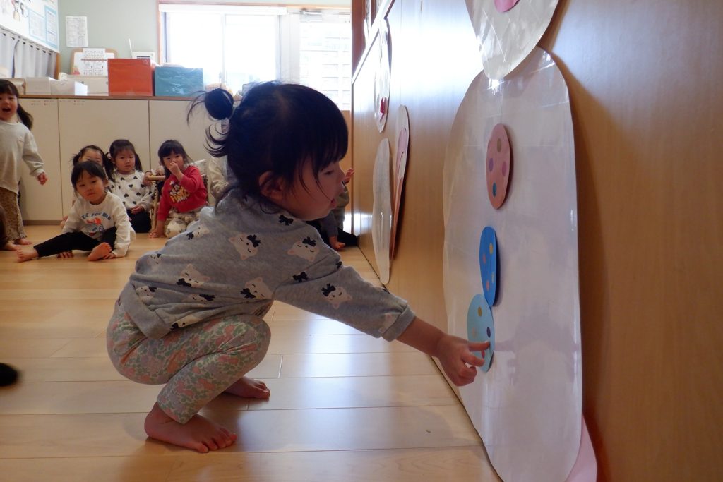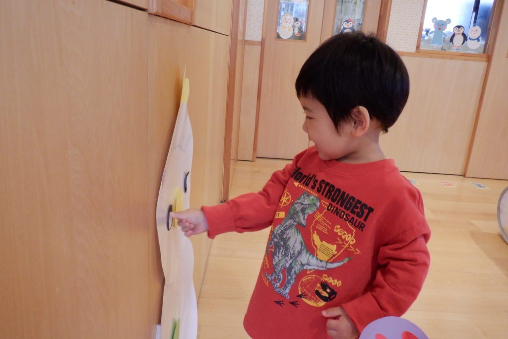 見つけると「あった~!!!」と嬉しそうな子ども達💖「めめ!」「青!」「お口!」と嬉しそうにお話をしながら雪だるまに貼ってくれましたよ💓